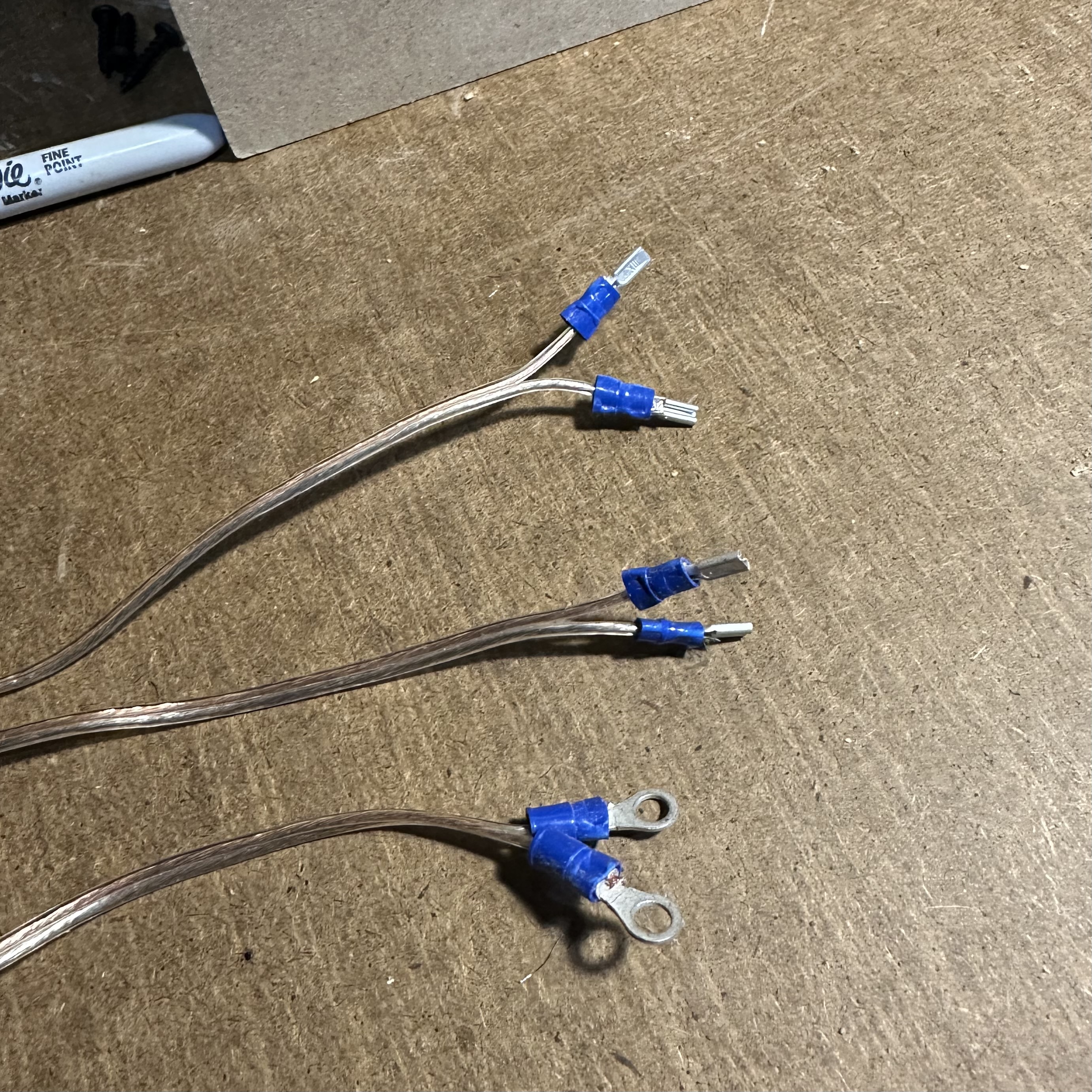 - Attach crimp connectors at one end of each length of wire. One wire will have two ring-type connectors and the other two will have "slide-on" connectors. Use needle-nose pliers or a crimping tool, if you have one. Crimp the connectors securely! (Squeeze the hell out of them!) Make sure they are not loose. (If they are loose, ask for new ones and try again.)