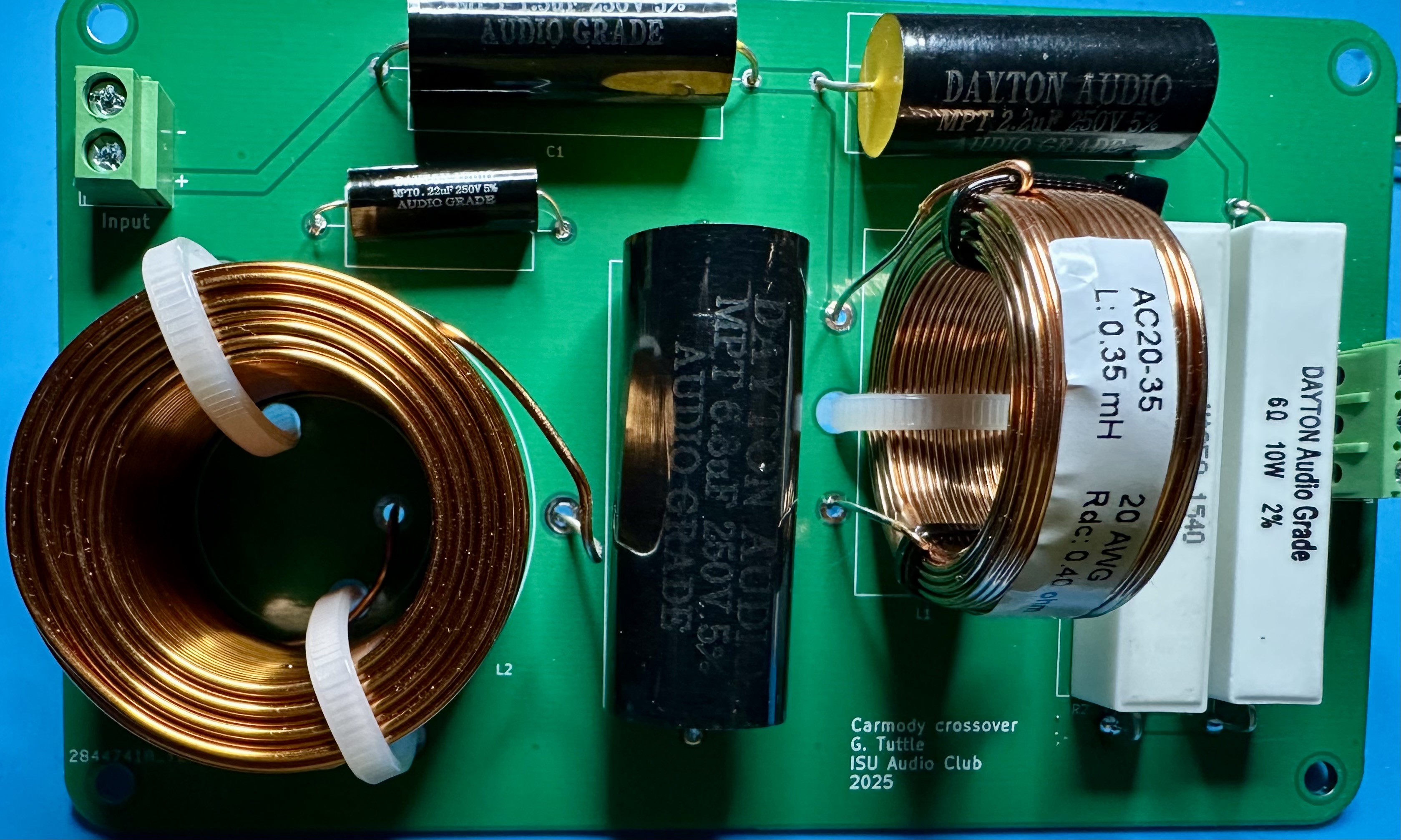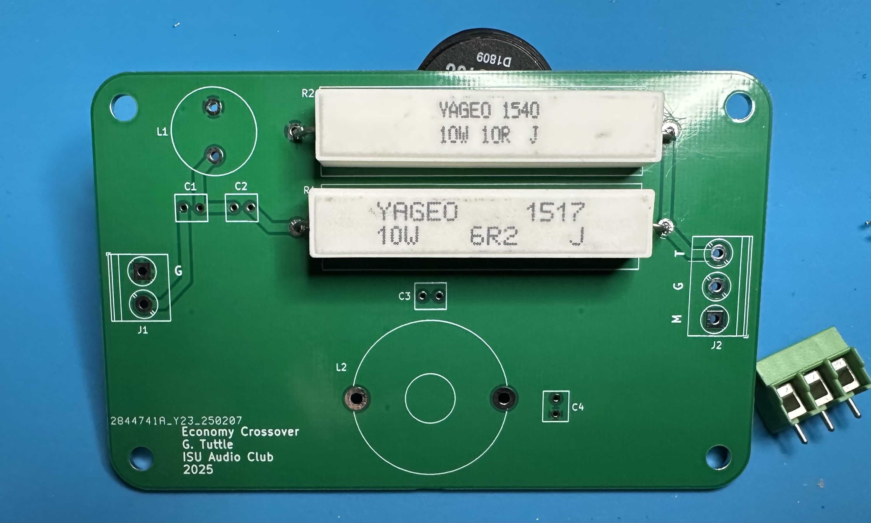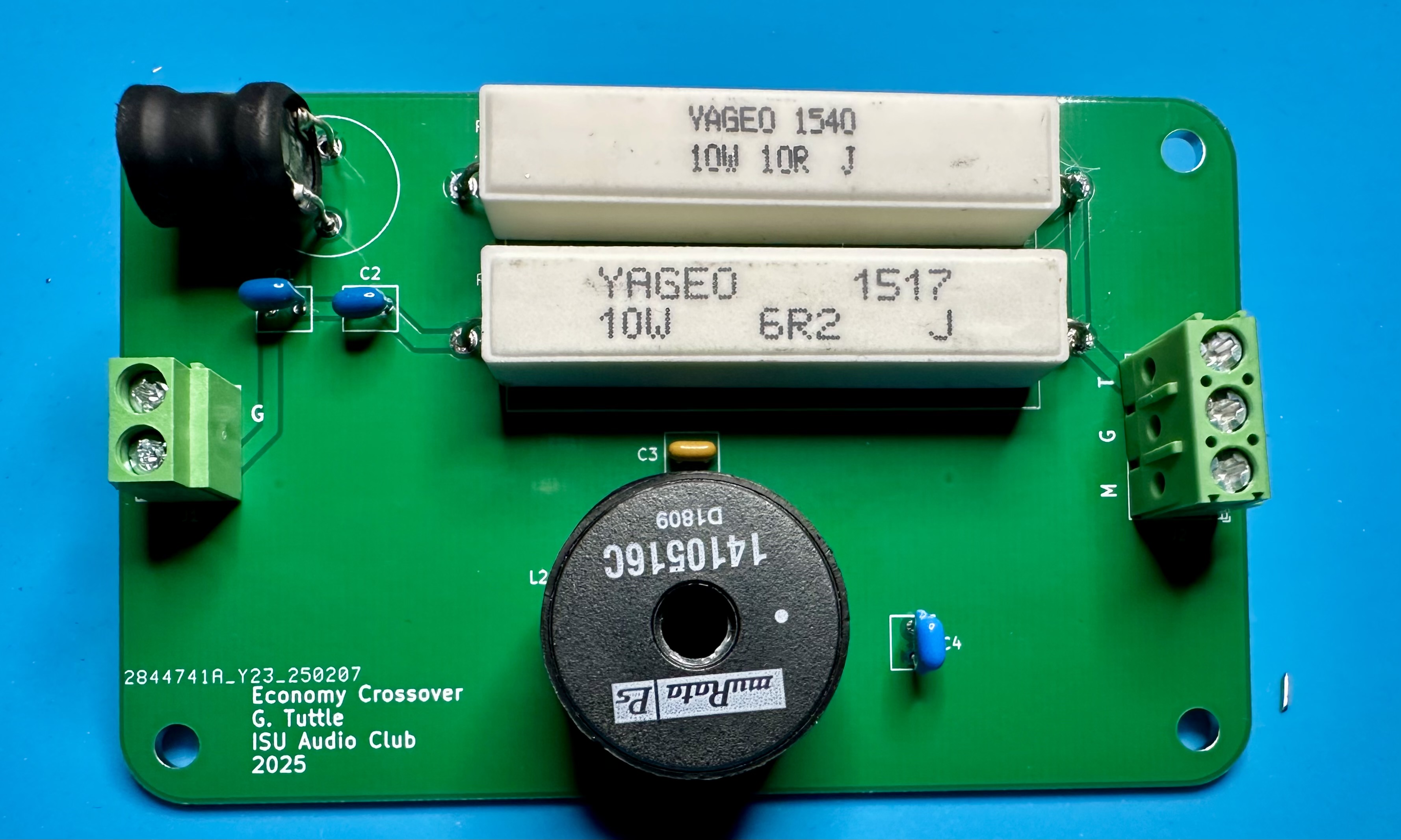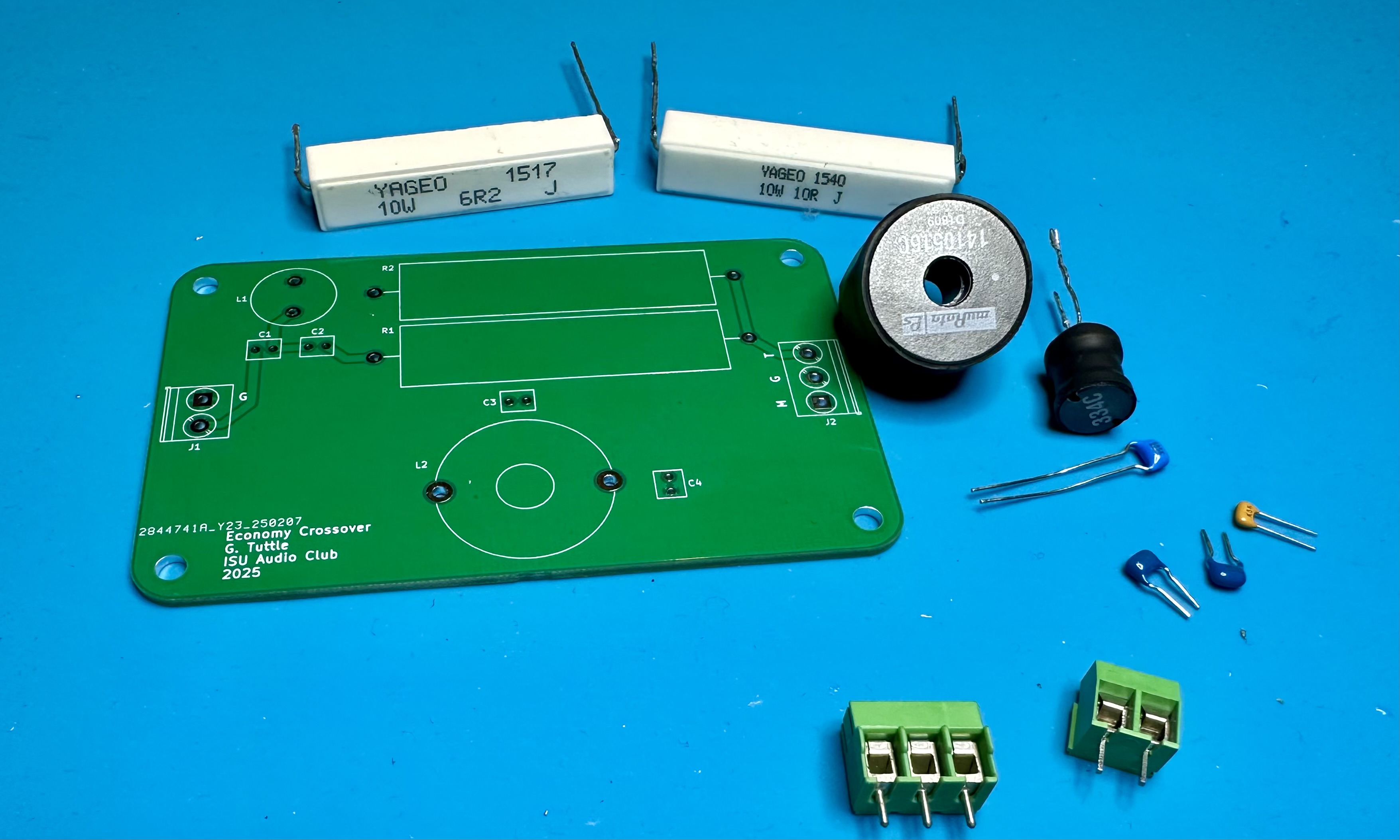 Special note for Fall 2025/Spring 2026 builders: I made a slight change to the PCBs recently, and there is a subtle difference between the old and new versions. The older version used one 2-postion terminal block — for the input — and one 3-position terminal block — connected to both mid-range and tweeter. The newer version uses three 2-position terminal blocks — one for the input, one for the mid-range, and one for the tweeter. Depending on how the board supply is depleting, you may have received the older version. The two different versions function identically. The only difference is during the final assembly when connecting the PCBs to the speaker drivers. The photos used below were taken using the older version, so the instructions and the photos may not match exactly.