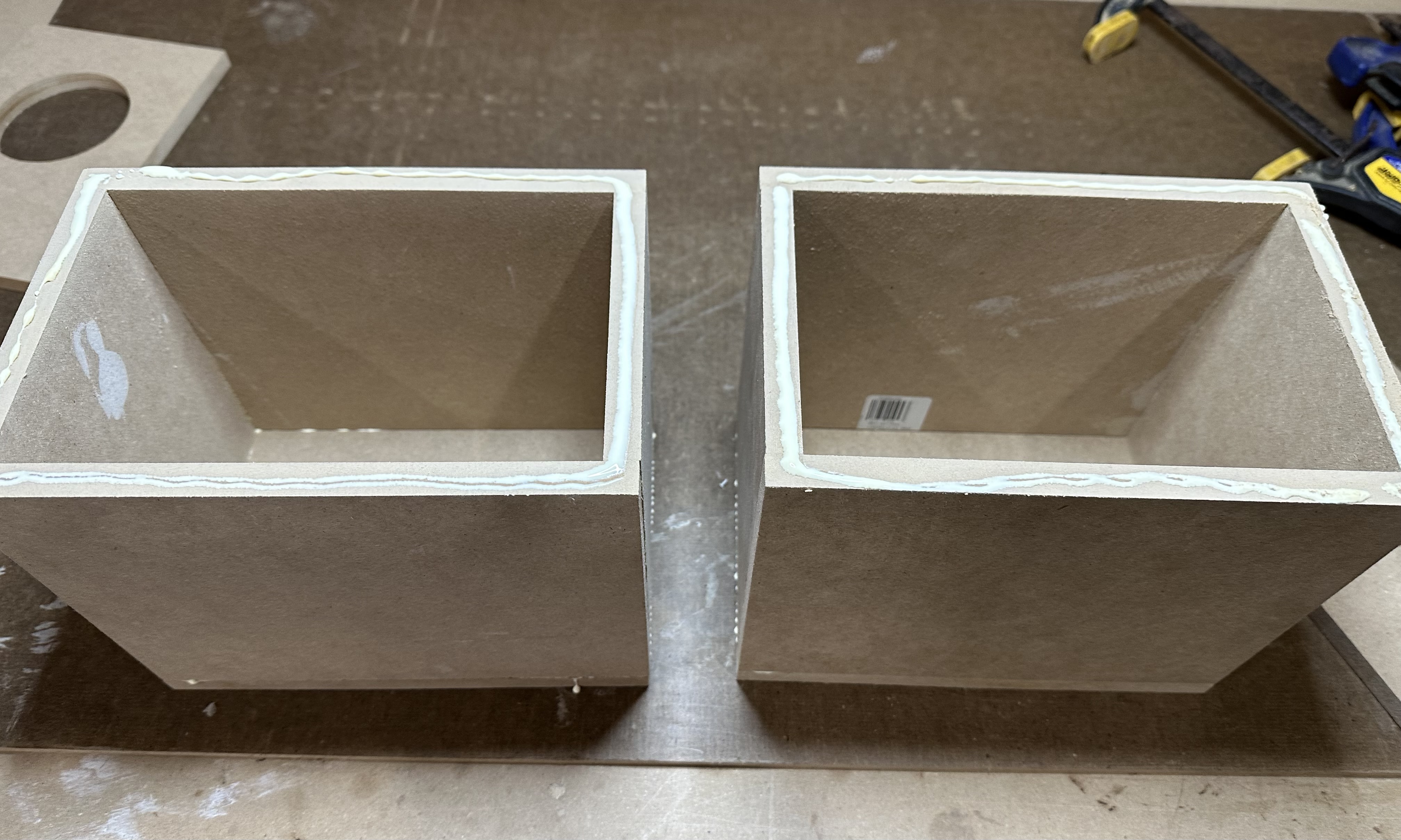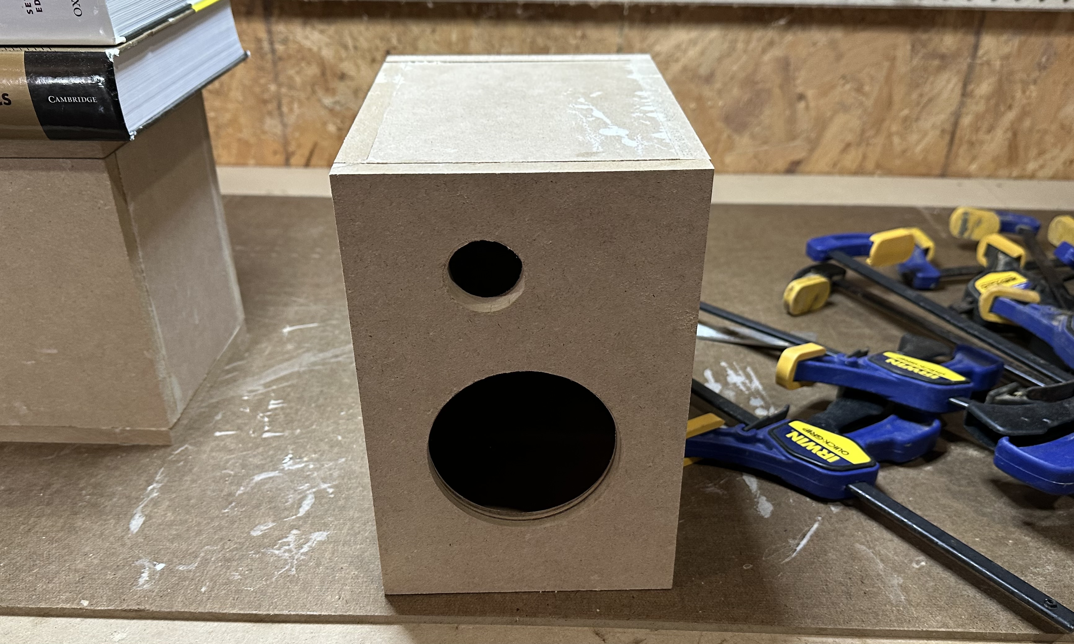 The speaker project requires two identical speaker boxes. Probably the best approach for the inexperienced is to do them one at a time rather than in parallel. The text of the instructions below is written with the assumption that the two boxes are being done sequentially. However, the photos show the two boxes being at the same time in order to show the use of both weights (in the form of a stack of text books) and clamps to hold the boxes together as the glue dries.