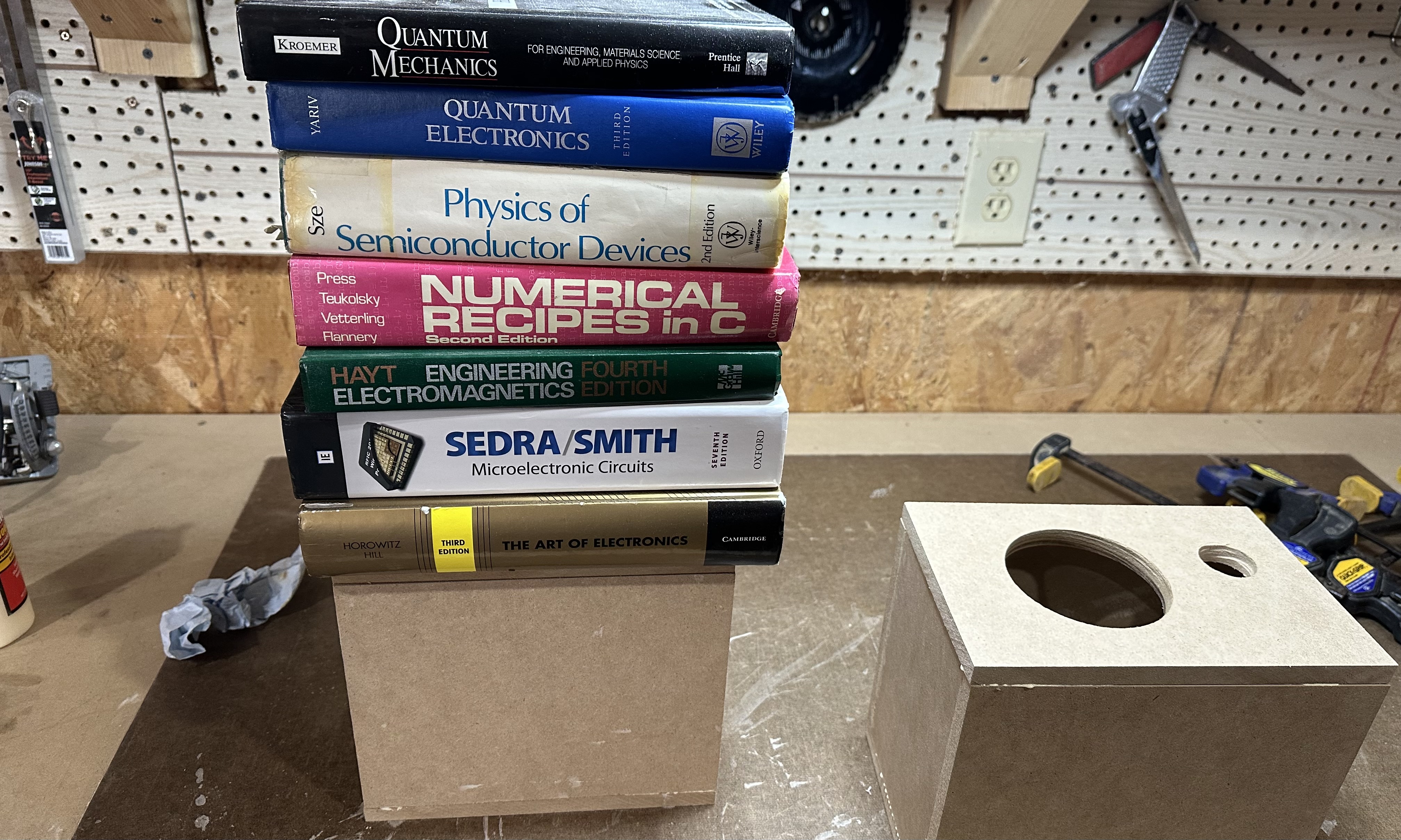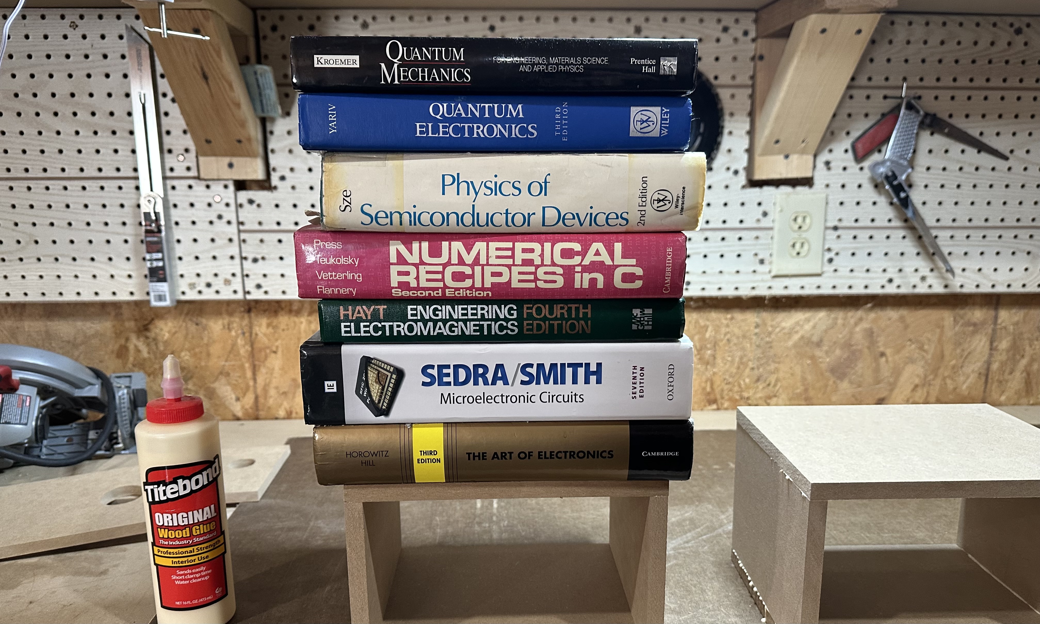 Many things can be used as a weight while the glue dries: a few books as shown here, a gallon jug of water, a couple of bricks, a dumbbell, an oscilloscope, a sleeping roommate. Eight to ten pounds (4 to 5 kilos) of weight should be adequate.