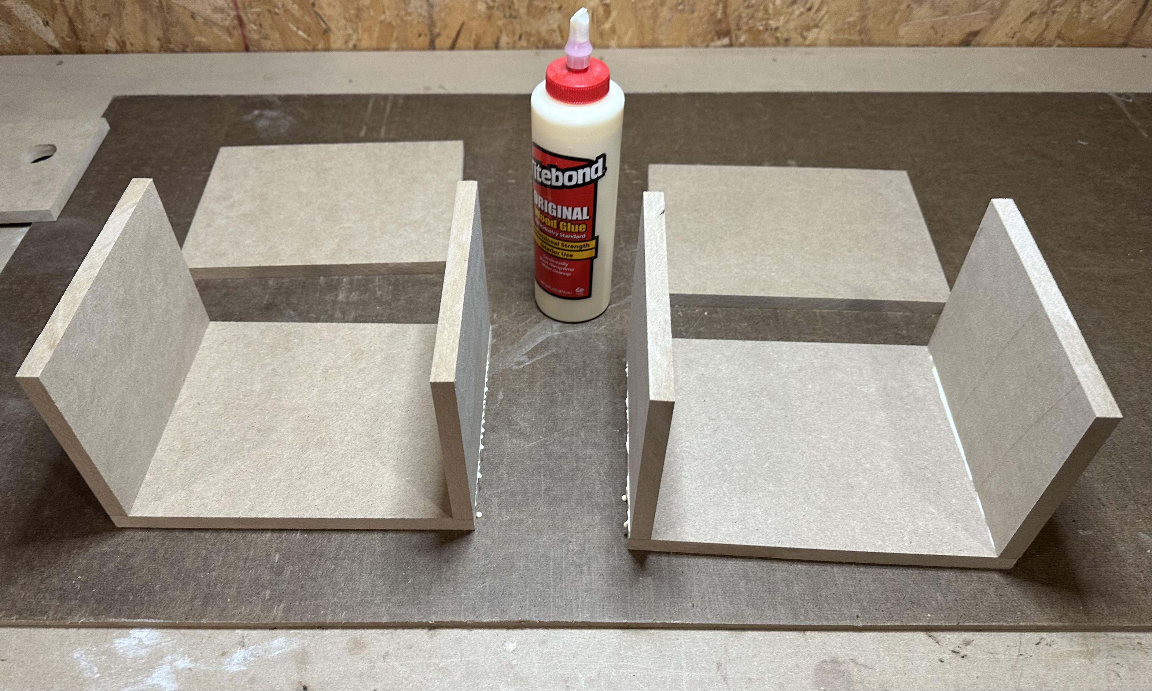 - Stand the top and bottom panels vertically on the side panel, with the edges set in the glue on the side panel.