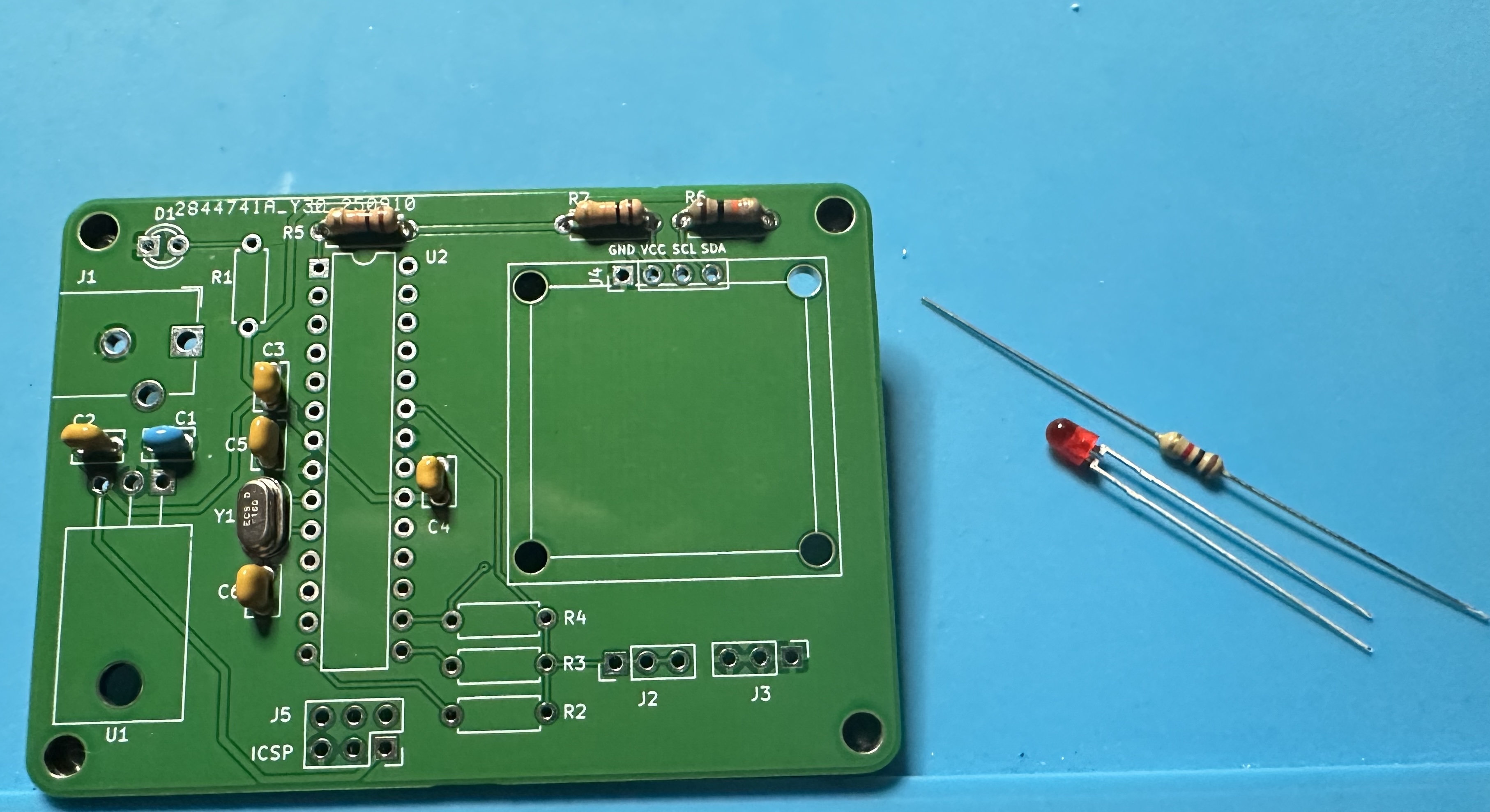 - Now, let's do the 16-MHz oscillator crystal (Y1) for the microcontroller and associated 22-pF (22J) capacitors (C5 and C6).