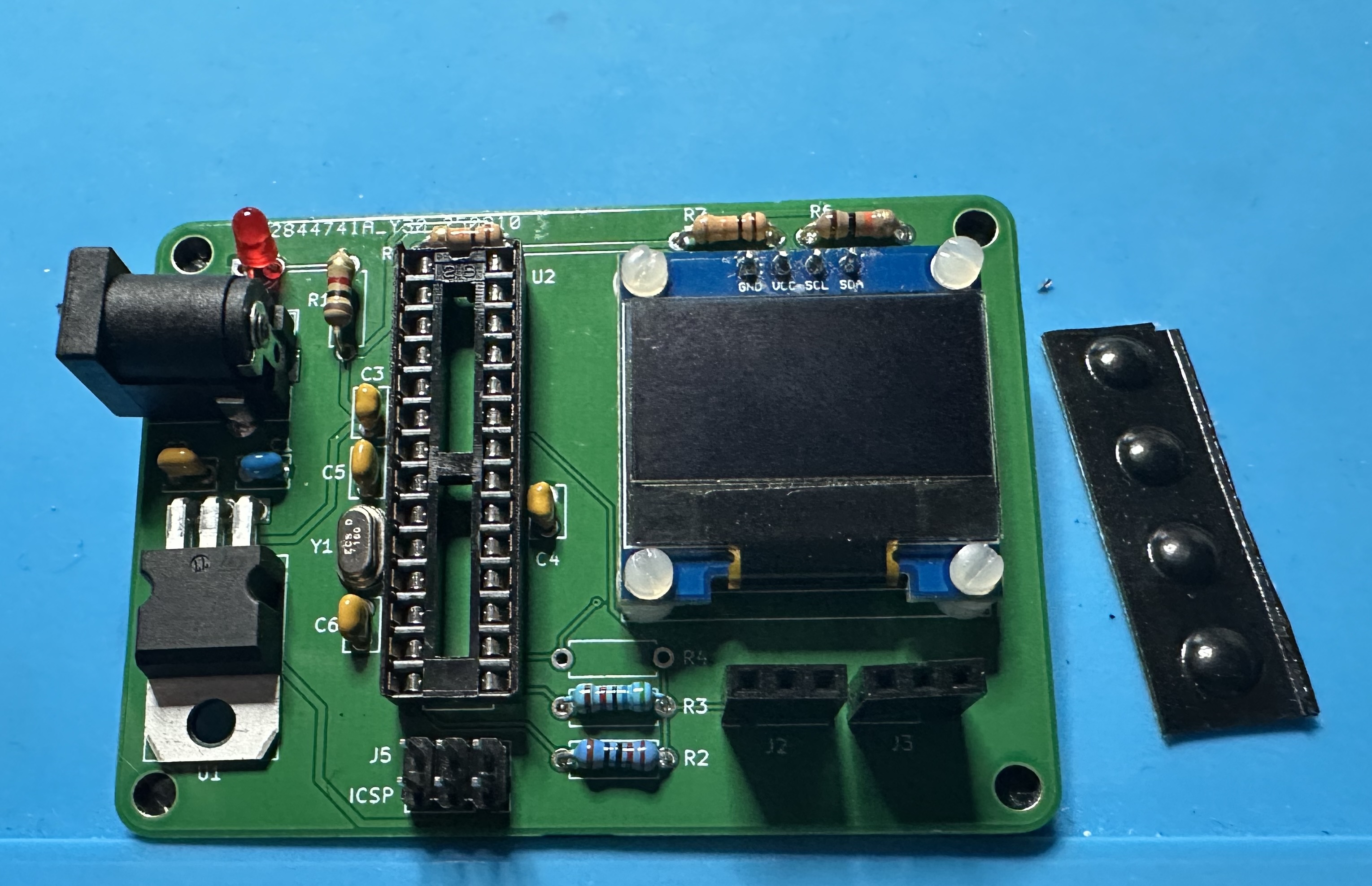 - Home stretch! Attach the OLED display and solder it in place. Suggested approach: Push all four of the nylon screws through the holes. It's a tight fit and you will need to apply a bit of force to get the screws through. (It will be OK!) The turn the display over and put the four spacers on the screws. Next turn the PCB over and insert it onto the display. Thread on the four nuts and use a screw driver to tighten everything up. Finally, solder in the four pins for the display.