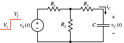 In the RC circuit, the source voltage has been at an initial voltage of Vi = 0 V for a long time. At t = 0, the source voltage abruptly jumps to Vf = 22 V.